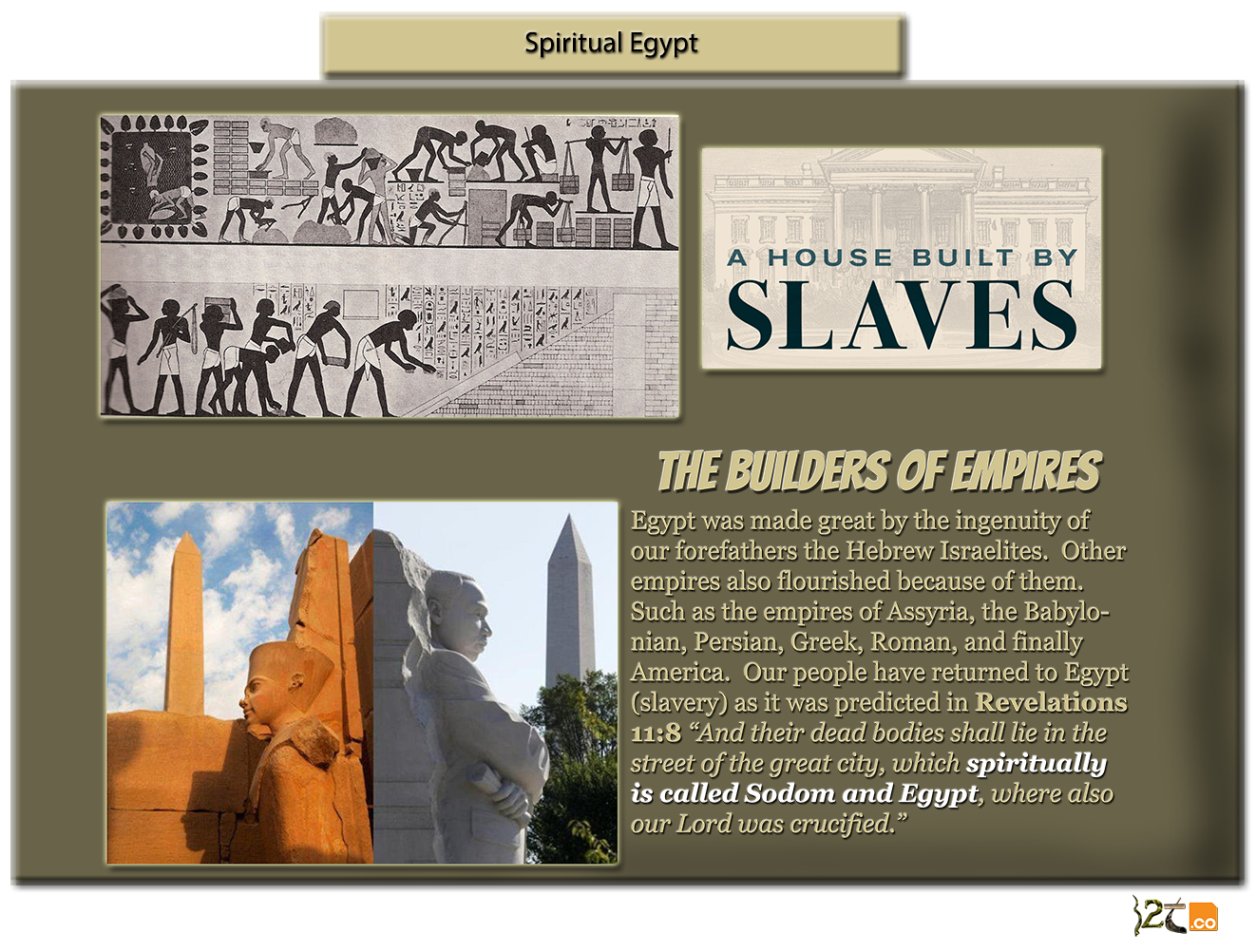 Revelations 11:8 “And their [Israelites] dead bodies shall lie in the street of the great city, which spiritually is called Sodom and Egypt, where also our Lord was crucified.” The book of Revelations speaks of a nation that will be known spiritually as Egypt. Since in this place our people will endure slavery like ancient Egypt. It is also known spiritually as Sodom because homosexuality will be accepted as in the destroyed lands of Sodom and Gomorrah. The great city in this scripture is America, the spiritual Egypt that our people were brought to in ships. The only group of people that were carried into slavery by ships are those of Negro, Native American Indian, and Hispanic descent. The prophecy or sign of Deuteronomy chapter 28 verse 68 only fits this group of people in the world.